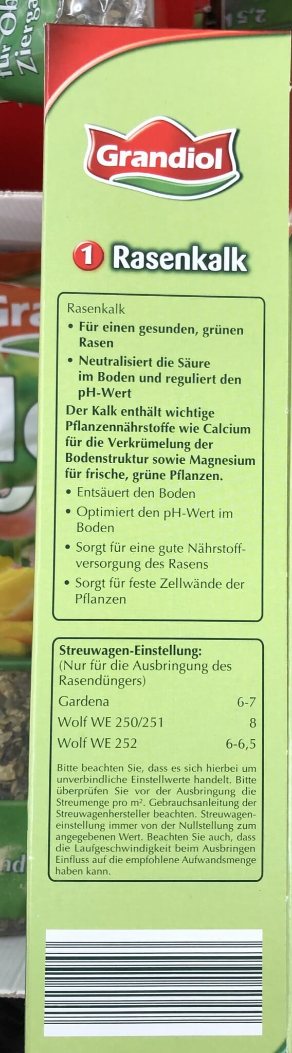 Laut der Verpackung sind folgende, unverbindliche Streuwagen-Einstellungen zur Ausbringung dargestellt: