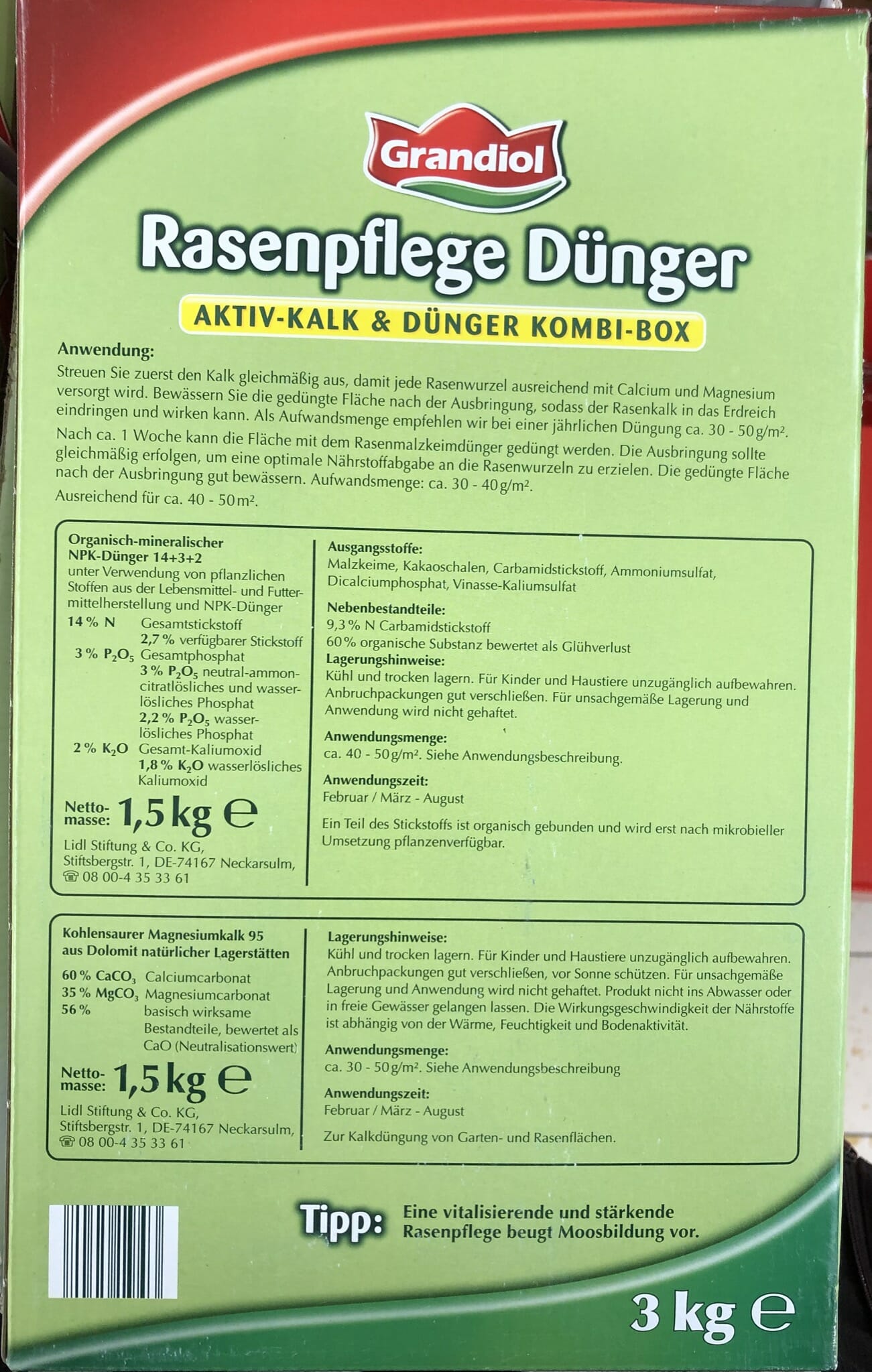 Besonderheit: Es handelt sich um ein Kombiprodukt aus Aktiv-Kalk und Rasendünger.